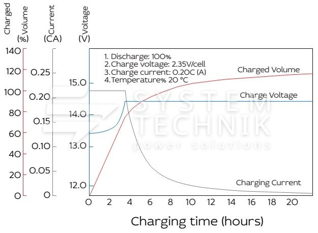 - Рекомендуемое напряжение заряда в циклическом режиме для 12В батареи: 13,8В-14,1В при 25ºС;